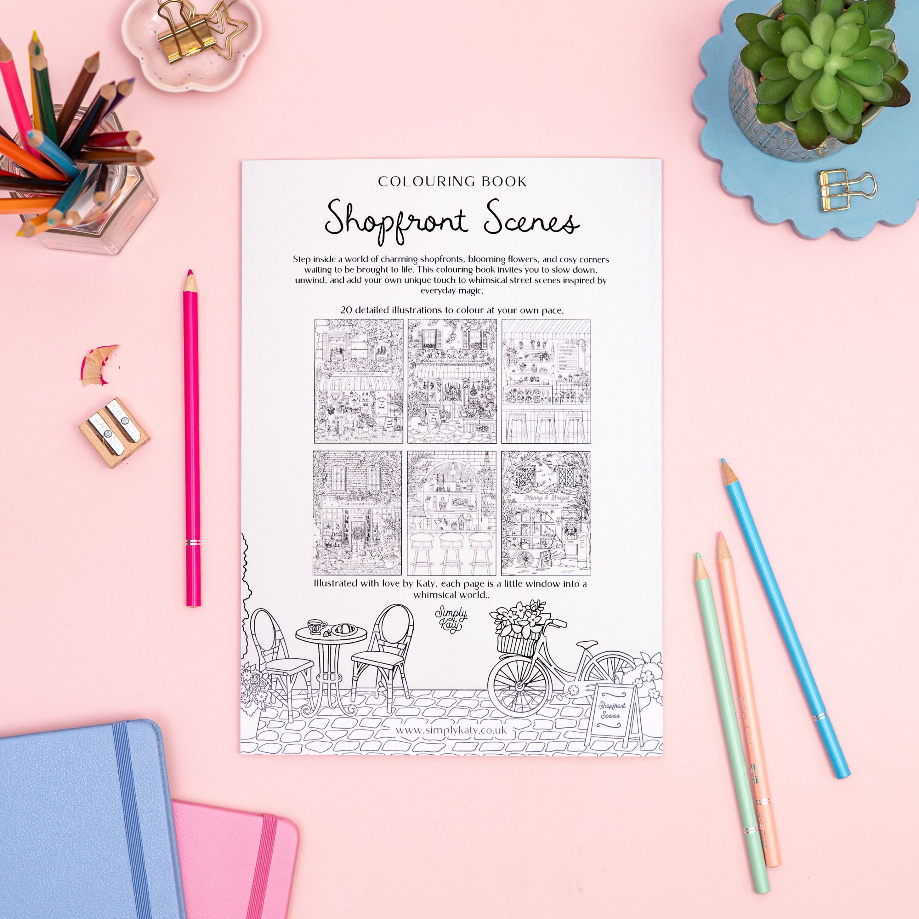A beautifully illustrated A4 colouring book featuring 20 original shopfront scenes by Simply, Katy — printed on premium 200gsm paper and designed to be treasured.