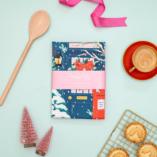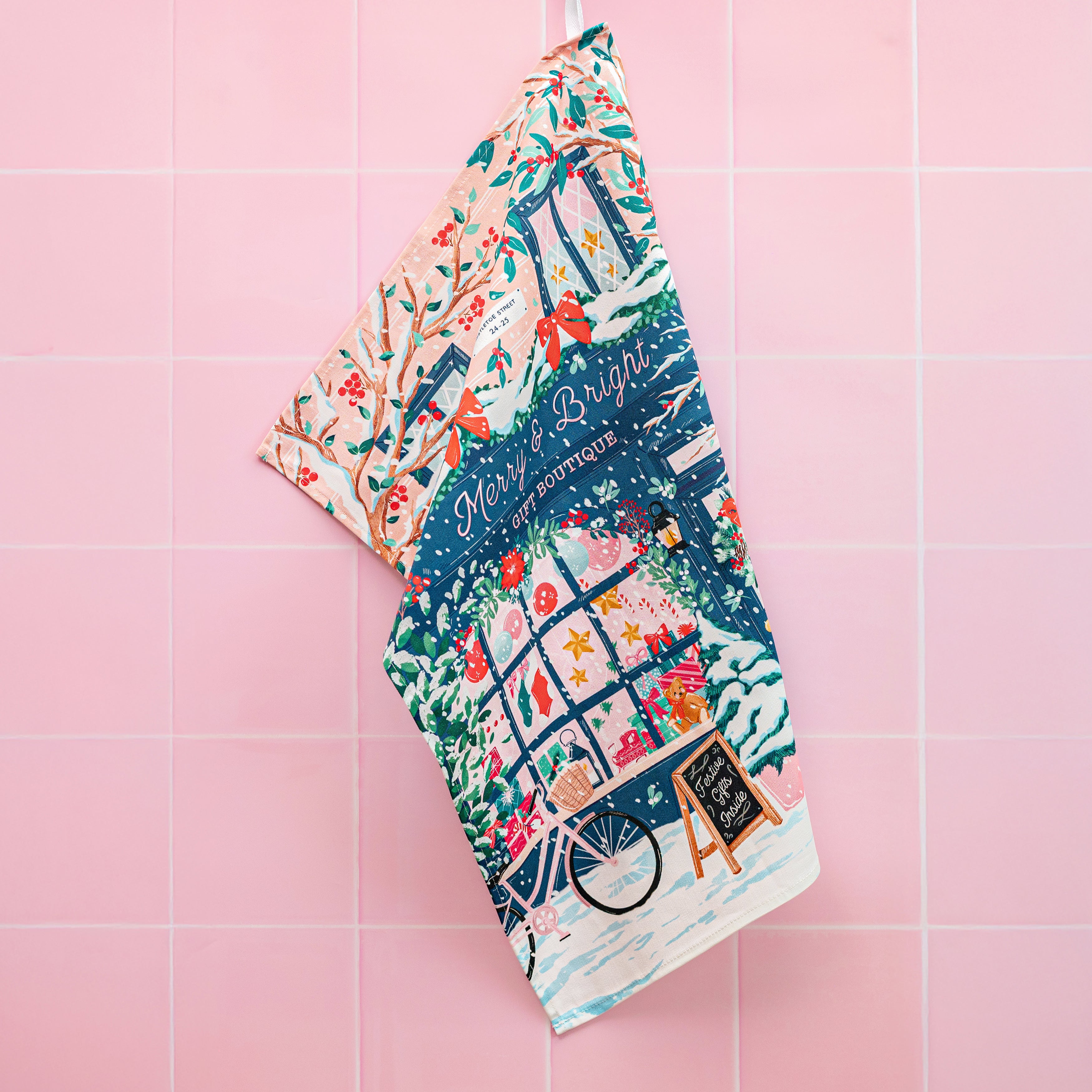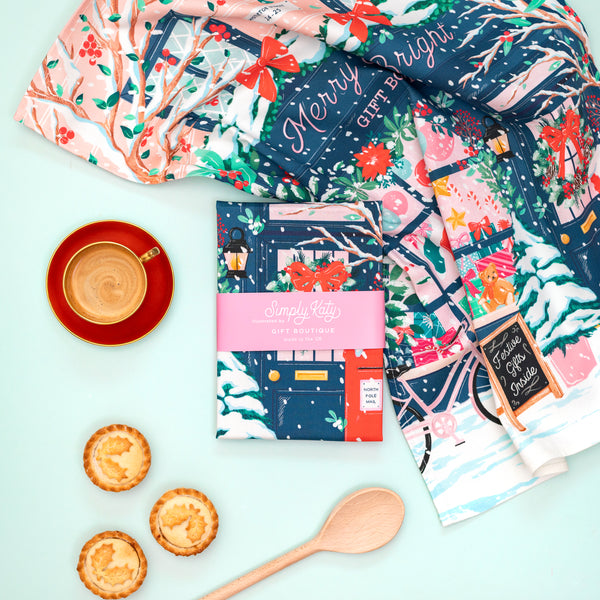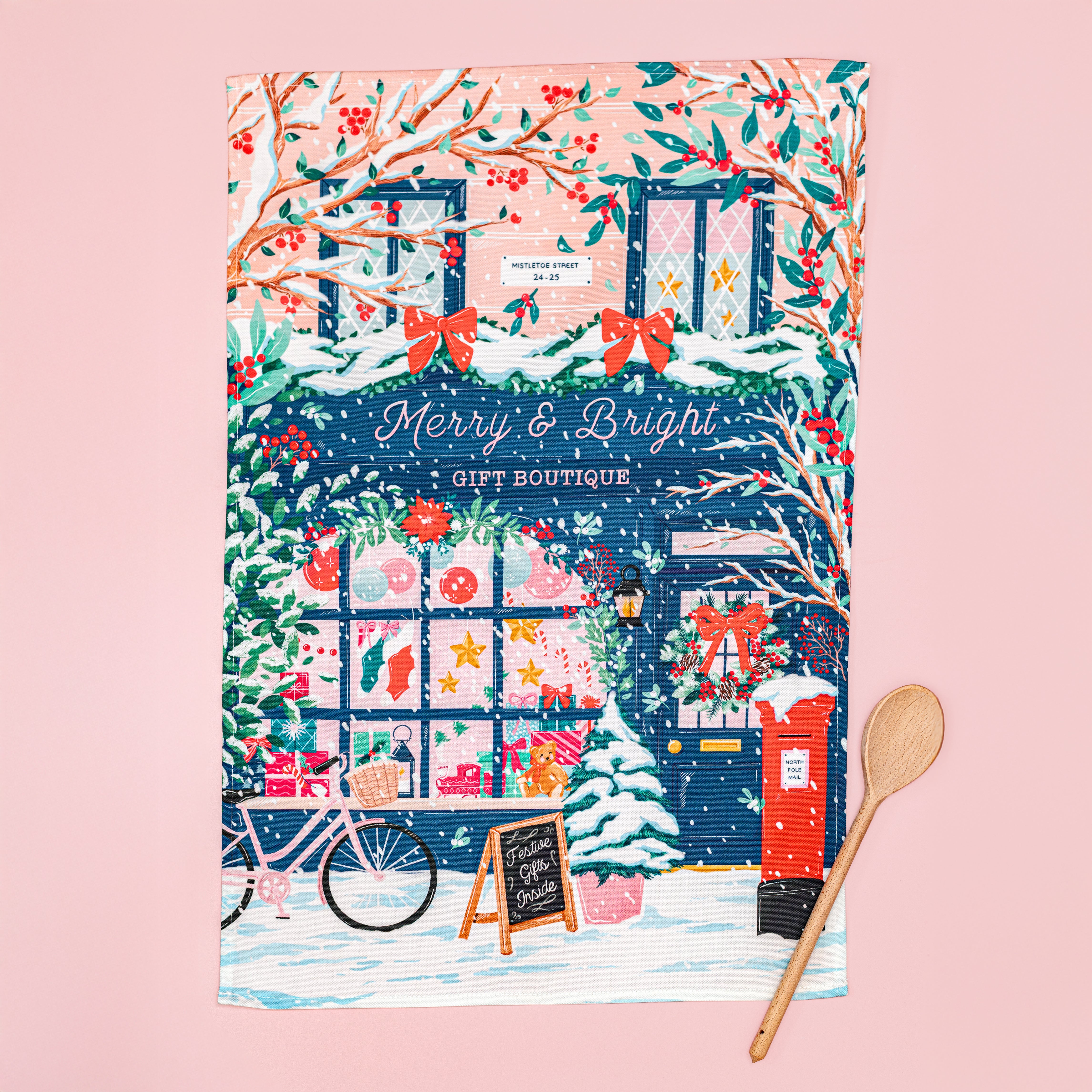 Bring festive cheer to your kitchen with our Merry & Bright Gift Boutique tea towel, illustrated by Simply, Katy. This charming scene captures the warmth and wonder of the holiday season — a snow-covered shopfront adorned with twinkling lights, festive garlands, and a postbox ready for Christmas cards. It’s the perfect piece to add a little seasonal sparkle to your home this winter.