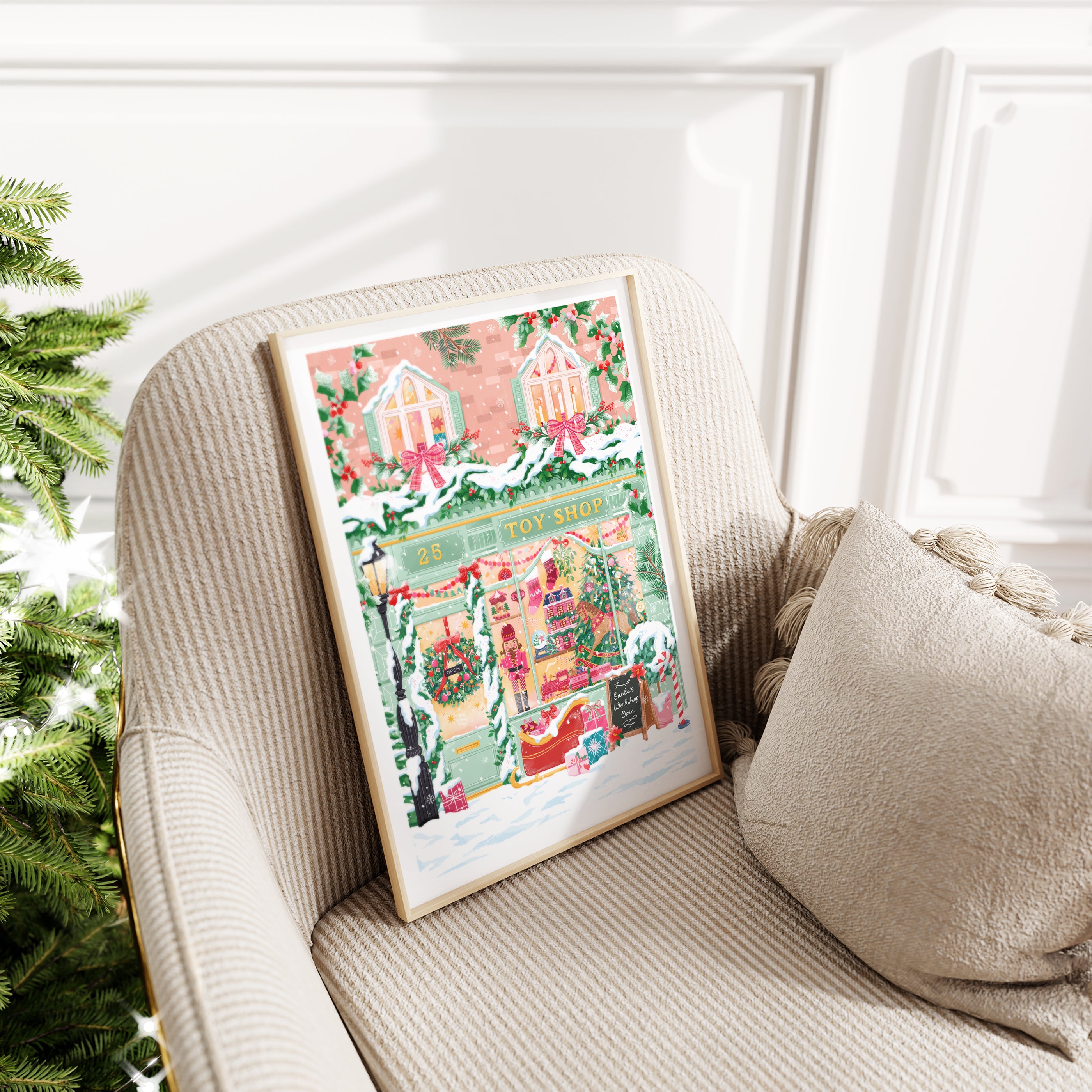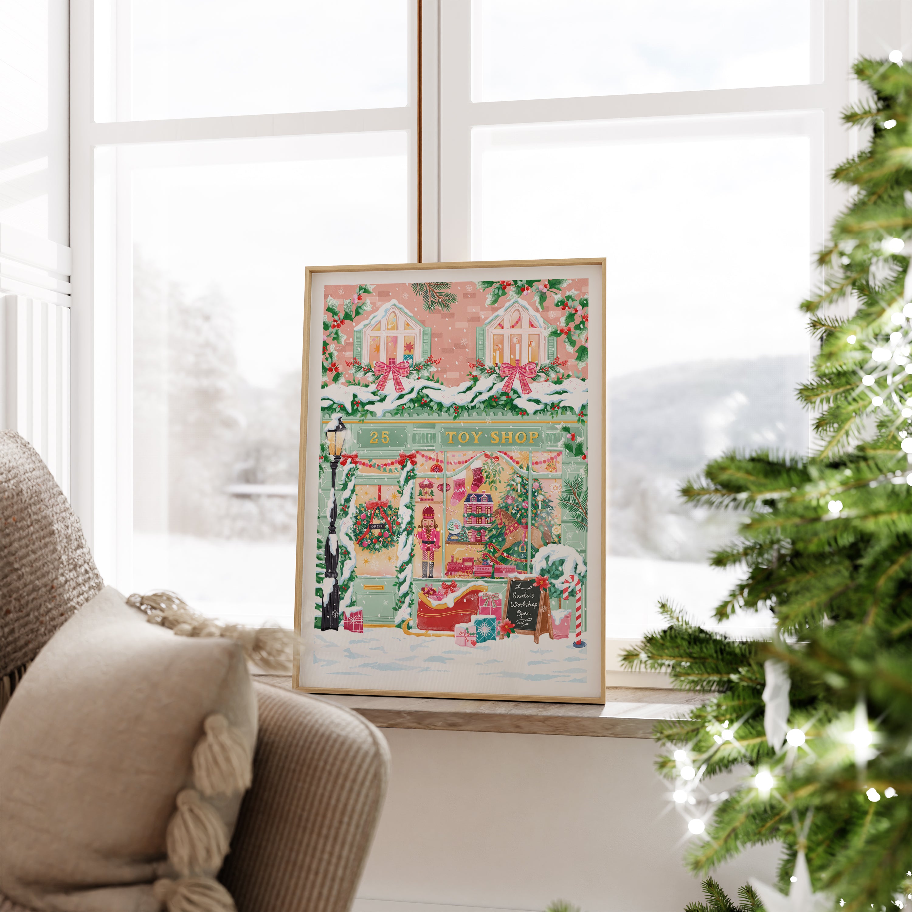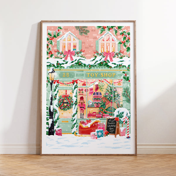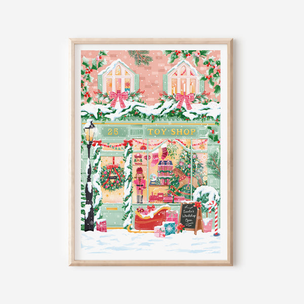 Step into the magic of Christmas with The Toy Shop art print — a festive illustration filled with nostalgic charm and holiday wonder.