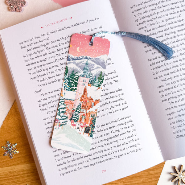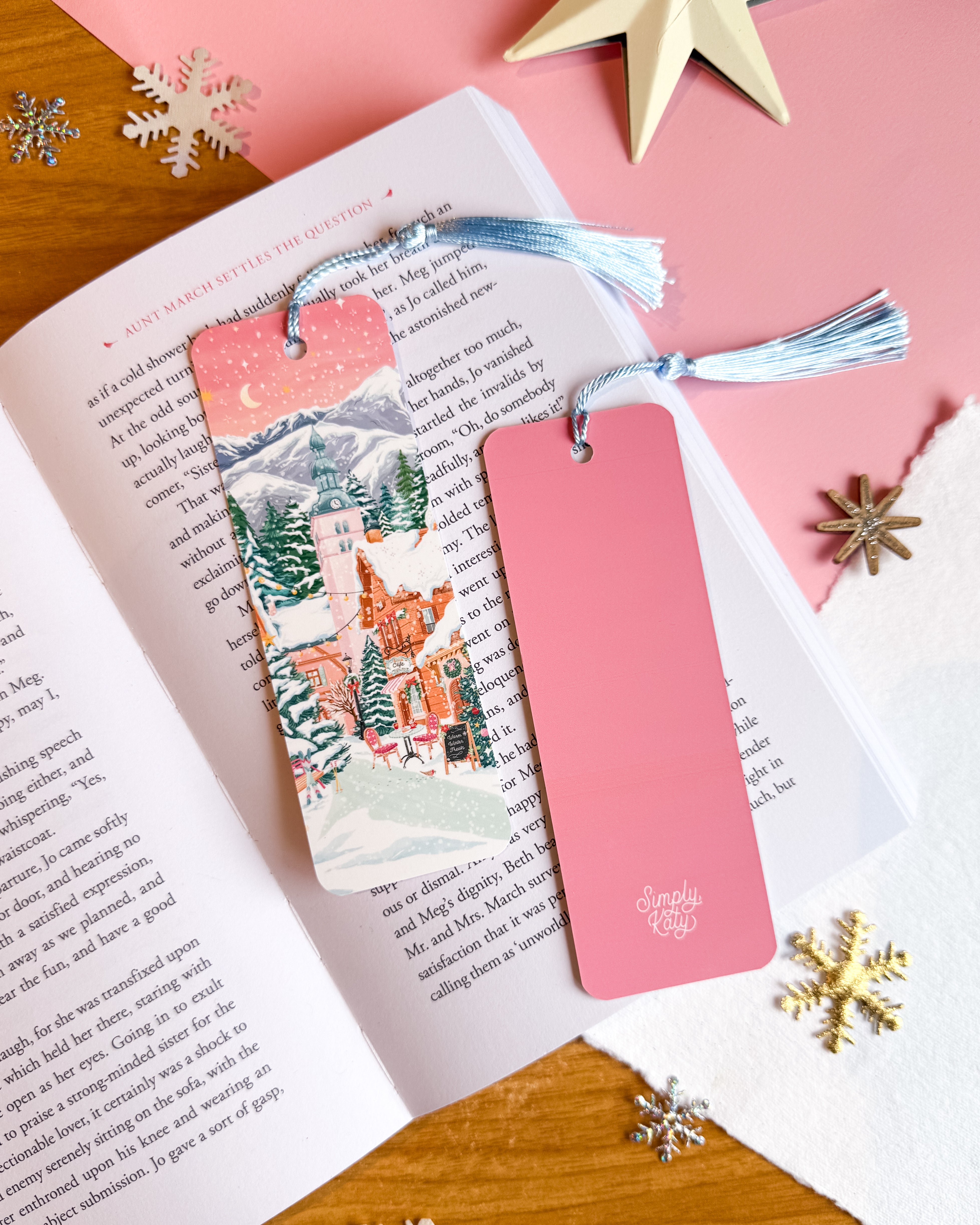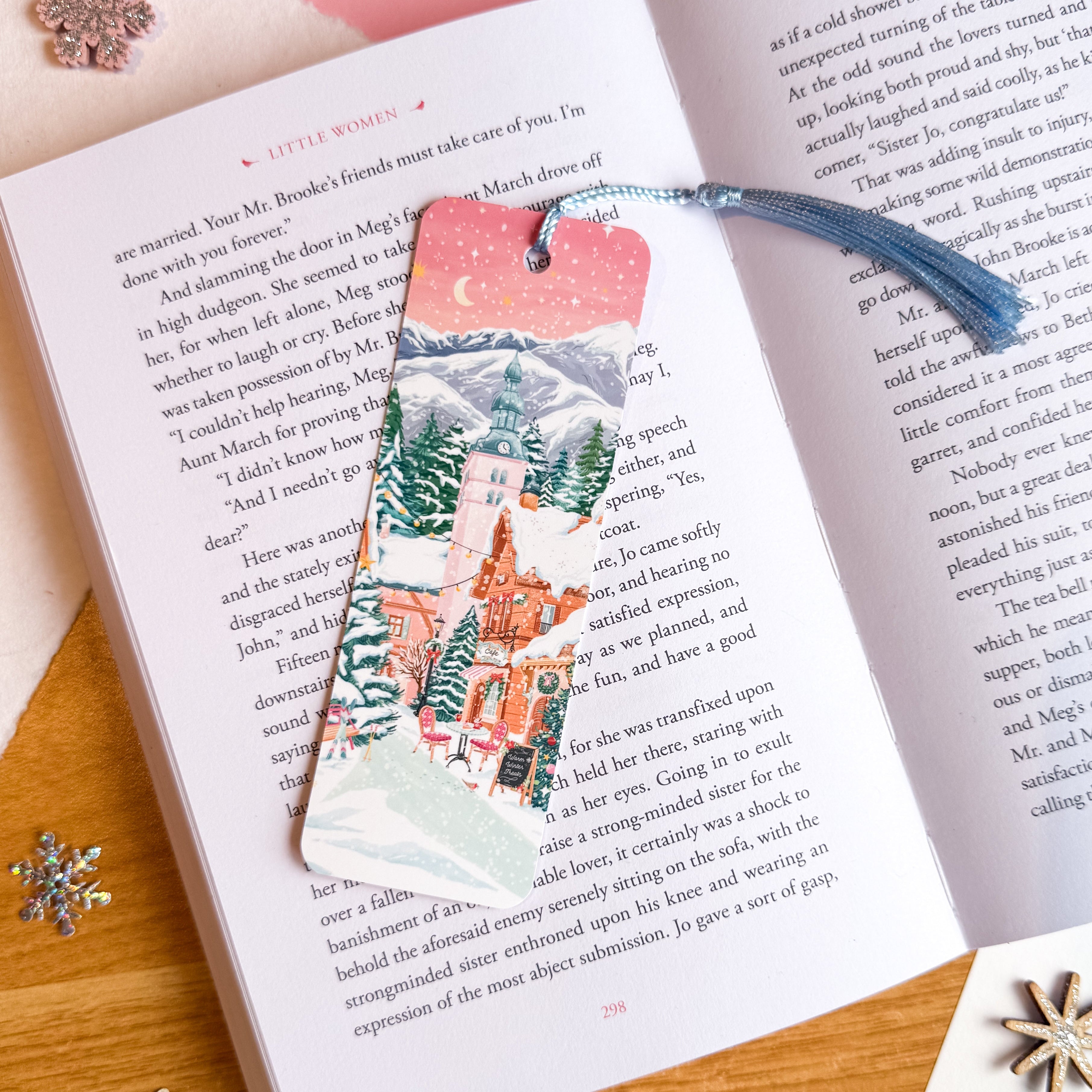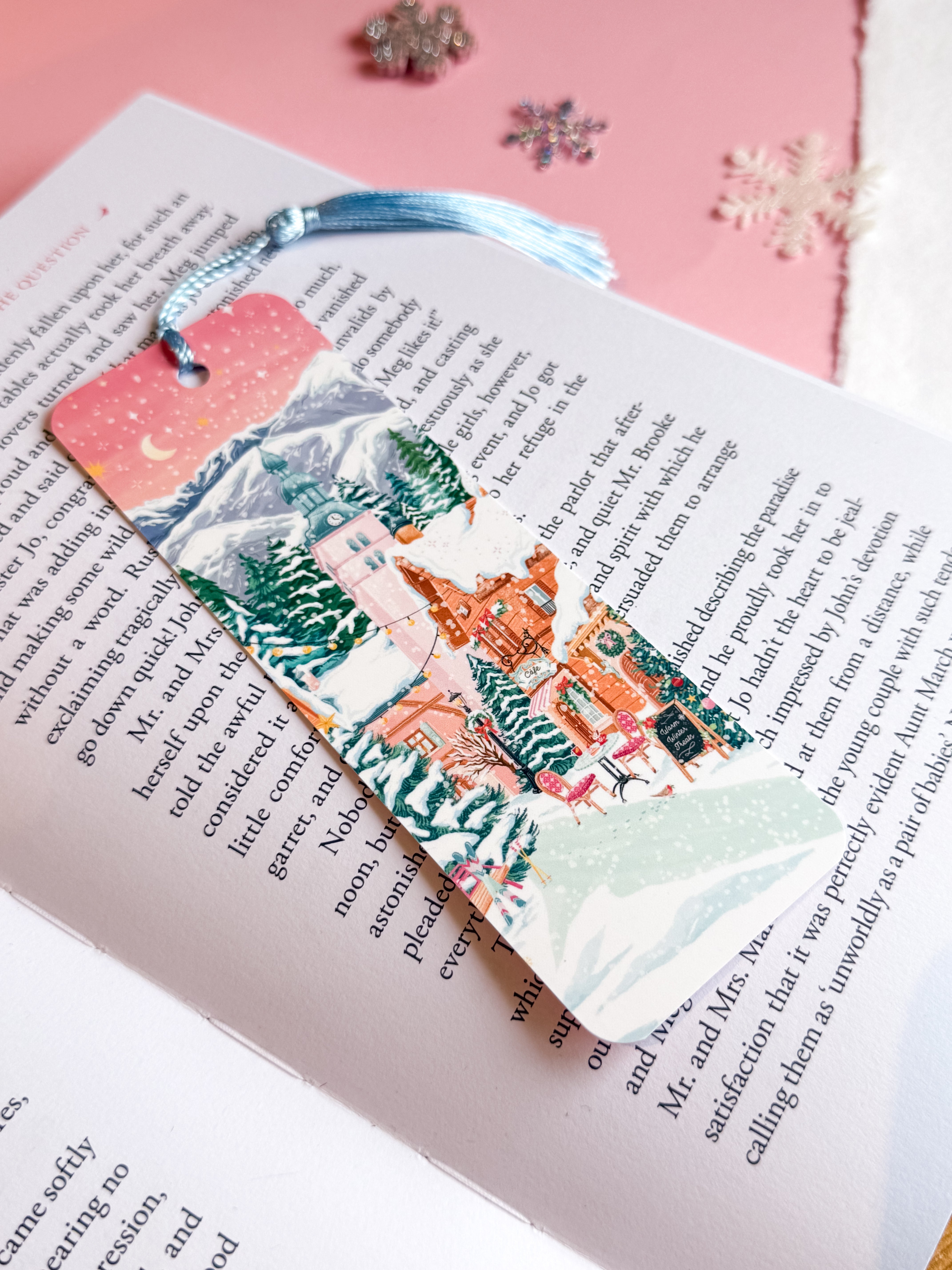 Escape into a storybook winter scene with our Christmas Village Bookmark. Illustrated by Simply, Katy, this design captures a snow-dusted alpine village glowing under a pink evening sky. From twinkling lights to charming cottages nestled between the mountains, it brings a comforting touch of festive magic to your reading moments. Perfect for cozy nights spent with a good book or as a thoughtful stocking filler for someone who loves the charm of Christmas villages.