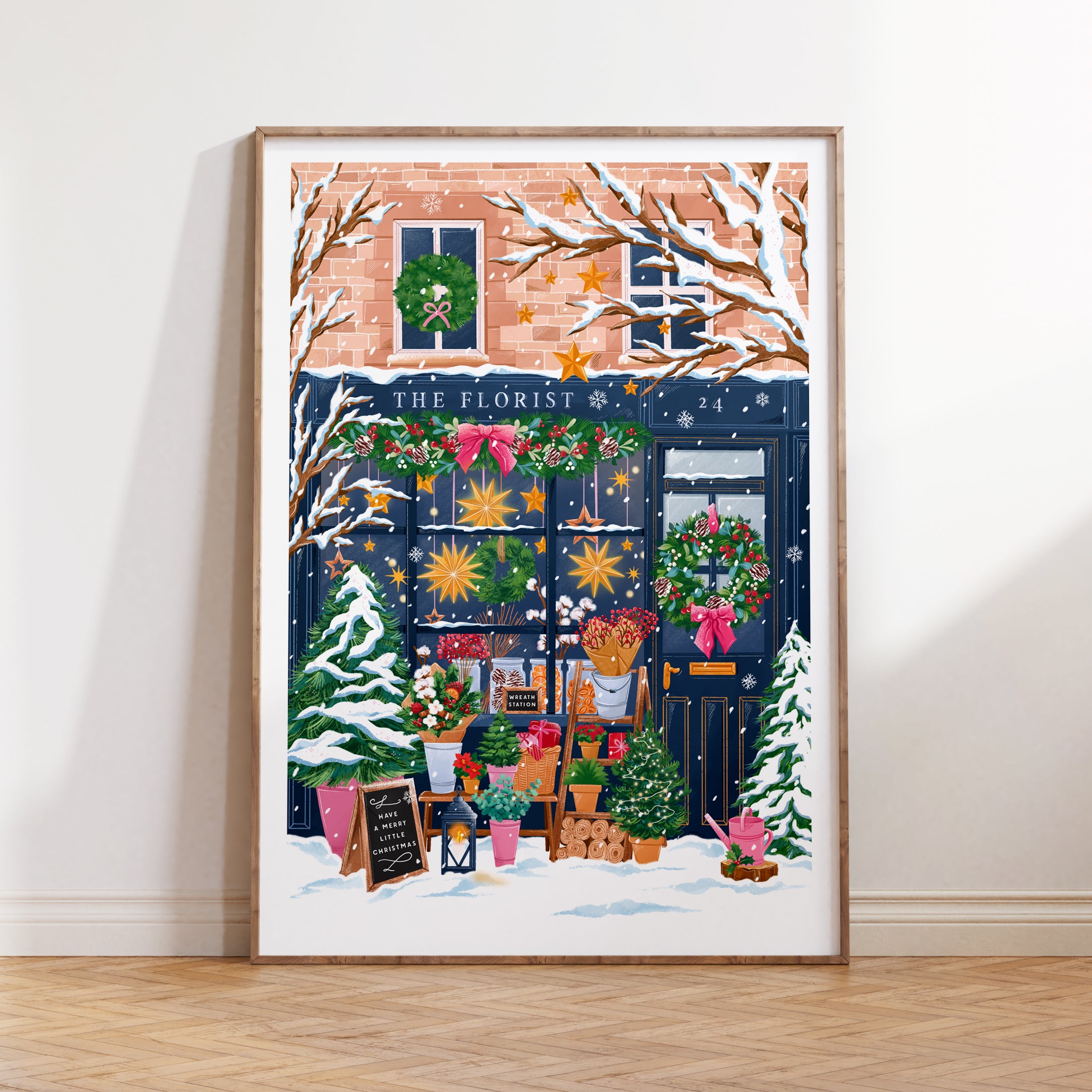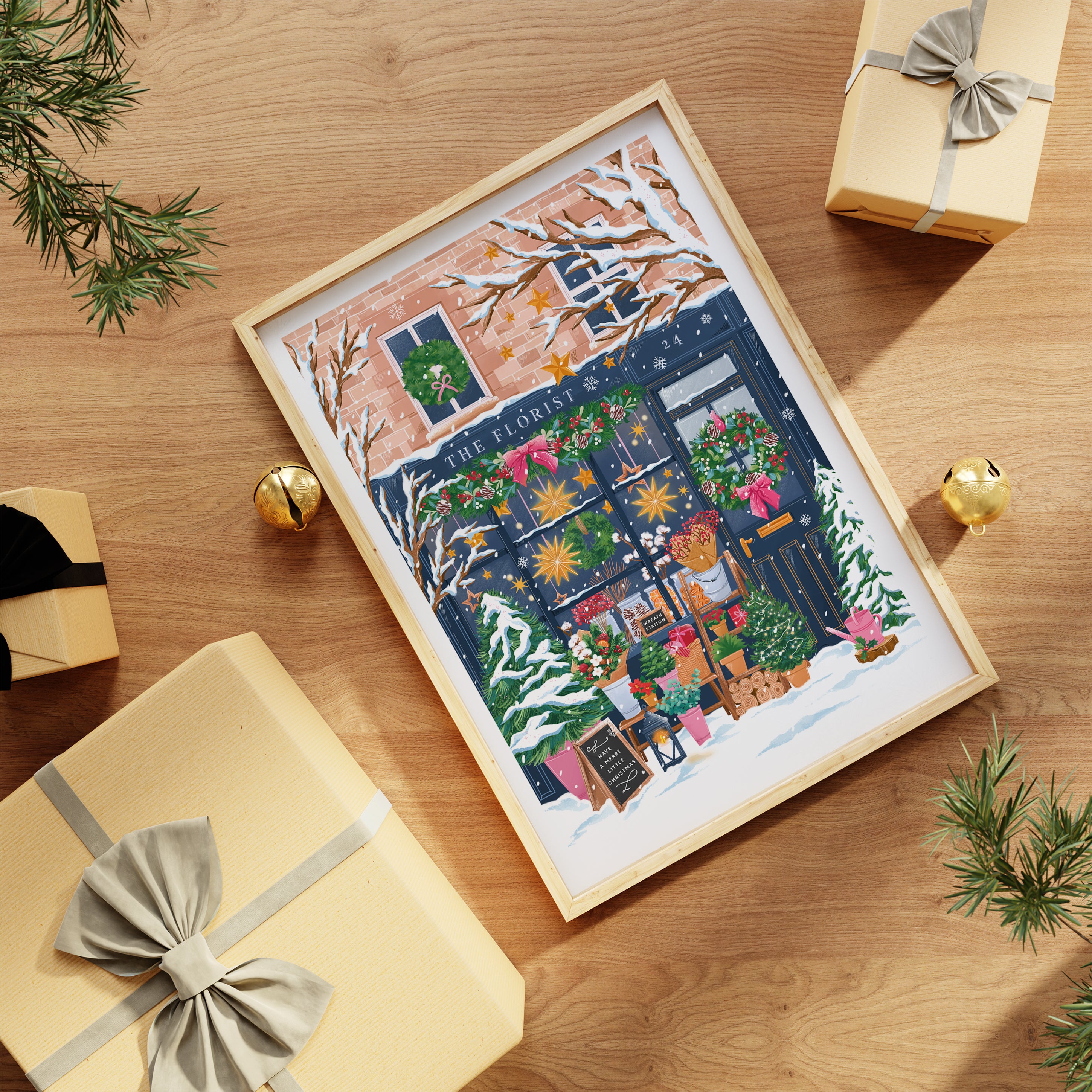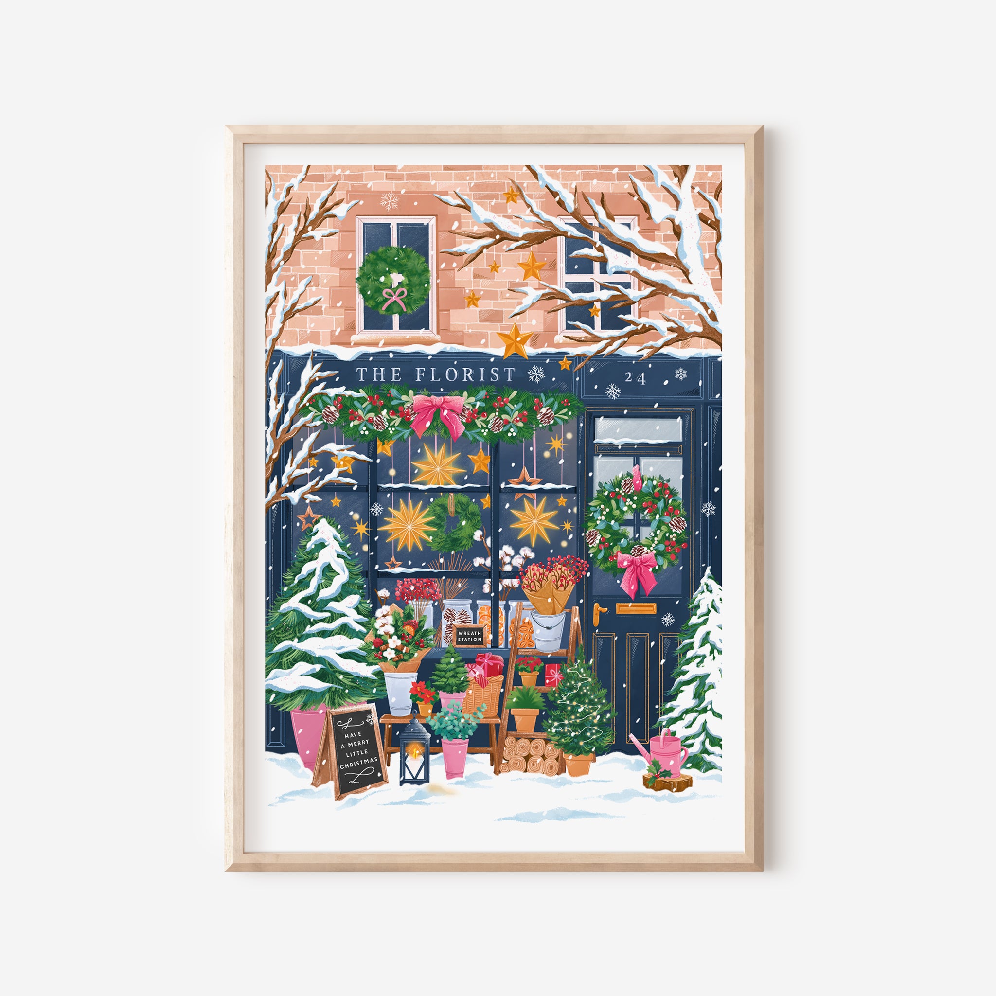 Illustrated by Simply, Katy, this piece celebrates the beauty of the season, with glowing star lights, frosted trees, and festive wreaths adorning the storefront.