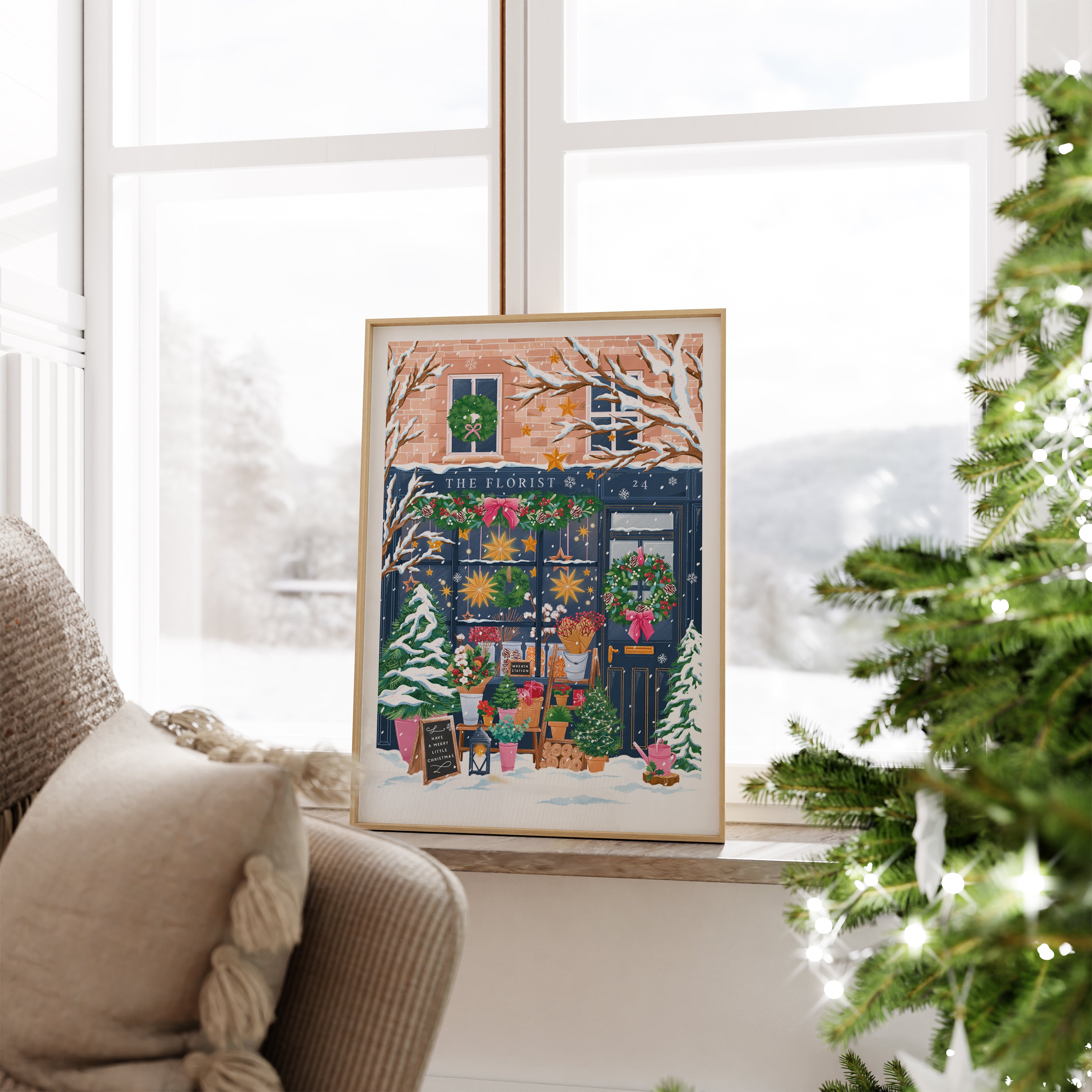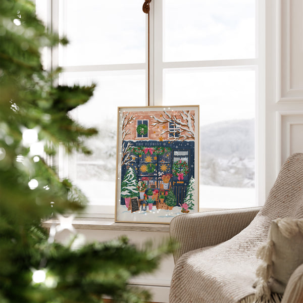 Bring a touch of winter charm to your home with The Florist art print — a cozy scene capturing the magic of a flower shop dressed for Christmas.